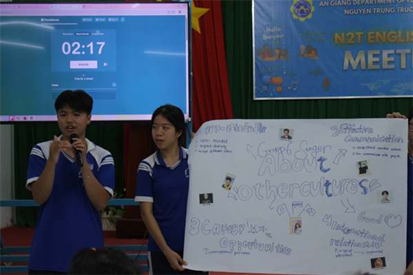 Chương trình diễn ra sôi nổi với nhiềuhoạt động hấp dẫn. Trong phần khởi động “Exploring Music”, học sinh tham giatrò chơi nghe nhạc đoán tên bài hát, ca sĩ hoặc thể loại nhạc, tạo nên khôngkhí hào hứng và thu hút đông đảo học sinh tham gia. Bên cạnh đó là các phần giao lưu, trả lời câu hỏi và thử thách kiến thức về âm nhạc và văn hóa quốc tếbằng tiếng Anh, giúp học sinh rèn luyện khả năng giao tiếp và phản xạ ngôn ngữ.