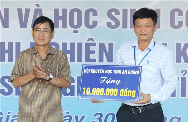Hội Khuyến học tỉnh An Giang trao tặng 10 triệu đồng để trường khen thưởng, trao học bổng cho học sinh.