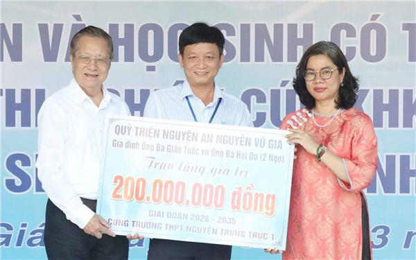 Dịp này, Quỹ Thiện nguyện An Nguyên Vũ Gia (TP. Hồ Chí Minh) tài trợ 200 triệu đồng cho quỹ khuyến học của Trường THPT Nguyễn Trung Trực 1 nhằm hỗ trợ trường khen thưởng học sinh có thành tích xuất sắc, tiêu biểu trong các kỳ thi cấp tỉnh và cấp quốc gia, giai đoạn 2026 - 2035.