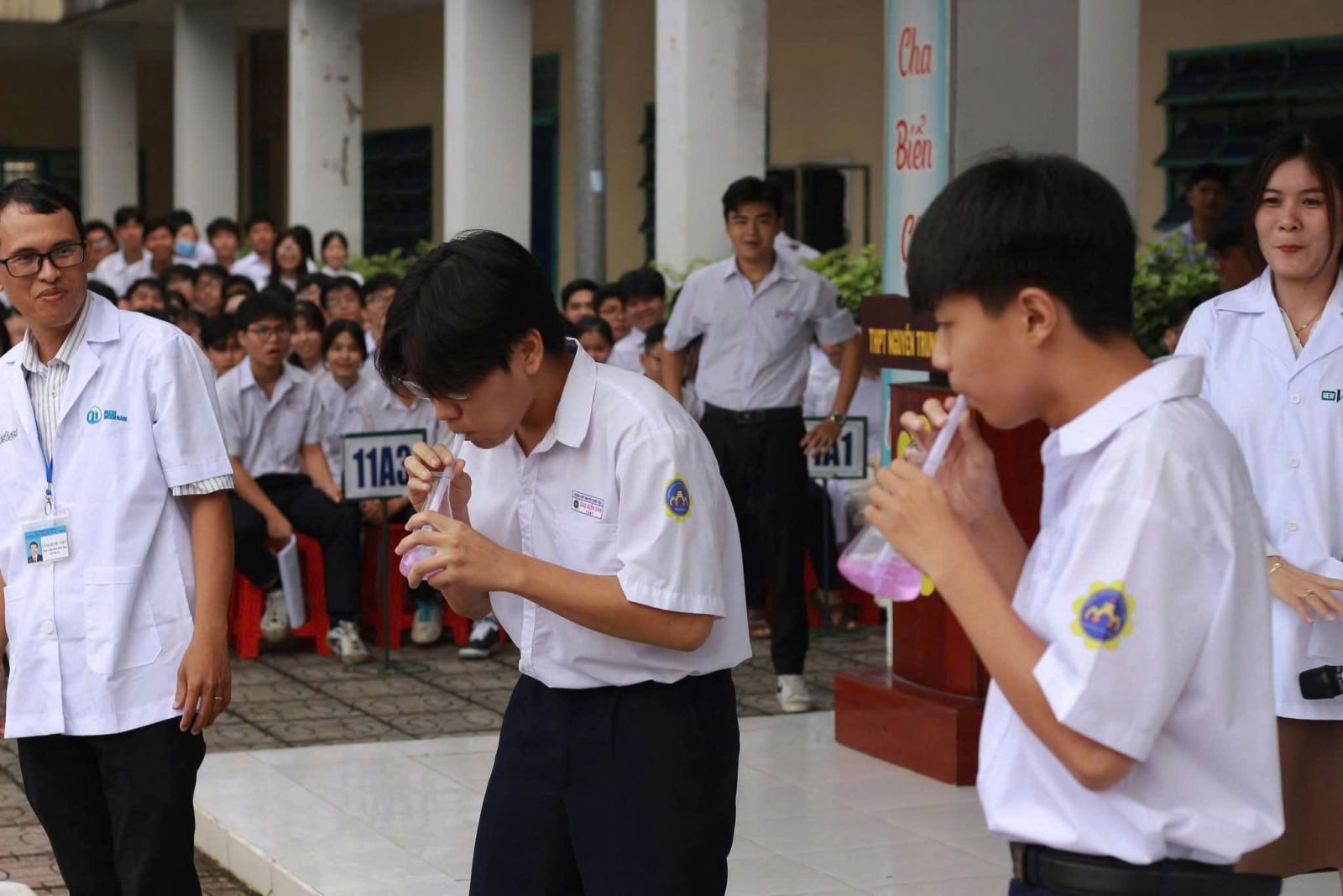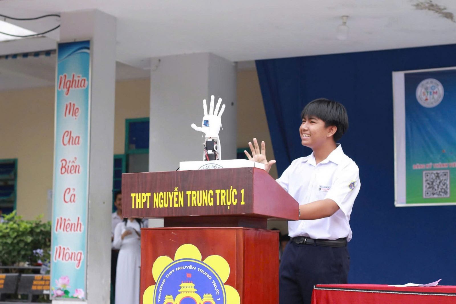 Không khí buổi lễ ra mắt sôi động lên khi các em được sở mục thí nghiệm nghiên cứu “Cánh tay rô-bốt điều khiển bằng hình ảnh”. Tác giả dự án là em Danh Duy Đăng, học sinh lớp 11A7, do thầy Mã Phước Lợi hướng dẫn. Cánh tay rô-bốt có thể bắt chước chuyển động của tay người, rô-bốt không cần dùng cần điều khiển hay nút bấm, chỉ cần camera nhận diện cử chỉ của người thật và làm theo. Trong buổi lễ ra mắt CLB STEM, các em còn được trải nghiệm cùng làm thí nghiệm hóa học với thầy cô Tổ chuyên môn Hóa - Sinh. Thí nghiệm phản ứng hóa học“Kem đánh răng con voi” đã mang đến màn trình diễn khoa học vô cùng thú vị. Với sự kết hợp giữa dung dịch hydrogen peroxide 30% (H2O2), potassium iodide (KI) bão hòa, nước rửa bát và màu thực phẩm, thí nghiệm đã tạo ra những cột bọt khổng lồ phun trào trông như dòng kem đánh răng khổng lồ, khiến học sinh vô cùng thích thú. Thí nghiệm sự đổi màu của chất chỉ thị theo pH của dung dịch, minh họa cho phản ứng phân hủy hydrogen peroxide có xúc tác, giúp học sinh hiểu rõ hơn về vai trò của chất xúc tác, sự tỏa nhiệt và sự hình thành khí oxygen trong phản ứng hóa học. Đây không chỉ là một màn trình diễn đẹp mắt mà còn khơi gợi niềm say mê khám phá khoa học và tinh thần học hỏi sáng tạo trong học sinh toàn trường. Sau phần trình diễn, nhiều học sinh hào hứng giơ tay trả lời các câu hỏi của ban tổ chức. Các em mạnh dạn nêu suy nghĩ, đưa ra nhiều giả thuyết sáng tạo và còn xung phong trực tiếp tham gia làm lại thí nghiệm dưới sự hướng dẫn của thầy cô phụ trách. Buổi lễ ra mắt Câu lạc bộ STEM khép lại trong niềm vui và kỳ vọng. Câu lạc bộ STEM chính thức đi vào hoạt động, hứa hẹn trở thành sân chơi trí tuệ, nơi ươm mầm những ý tưởng sáng tạo và nuôi dưỡng tinh thần nghiên cứu khoa học trong học sinh nhà trường THPT Nguyễn Trung Trực 1.
