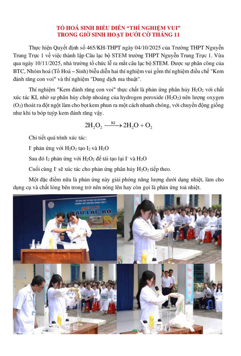 TỔ HOÁ SINH BIỂU DIỄN “THÍ NGHIỆM VUI” TRONG GIỜ SINH HOẠT DƯỚI CỜ THÁNG 11