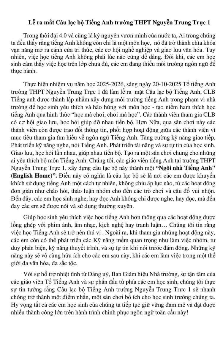 Lễ ra mắt Câu lạc bộ Tiếng Anh trường THPT Nguyễn Trung Trực 1